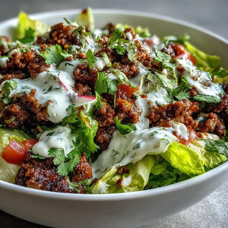 Save A vibrant and nutritious taco bowl featuring seasoned ground beef atop crisp lettuce, fresh tomatoes, radishes, cilantro, and a zesty lime yogurt crema. This Easy Mexican-inspired main dish is perfect for a quick 30-minute meal that is both gluten-free and packed with flavor.